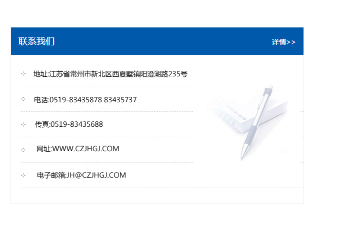 地址:常州市新北區友邦商務大廈1幢16、17層  電話:0519-85101652  傳真:0519-85112595  郵編:213022  網址:www.cz-jiayue_cn.beijingds.com  郵箱:xiajifengaa@163.com